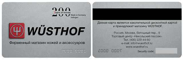 Карта постоянного покупателя Wuesthof предоставляется любому покупателю интернет-магазина или фирменного магазина Wuesthof, совершившему первую покупку, независимо от её суммы.