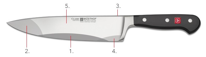 - пятка – та часть клинка, где при работе концентрируется максимум энергии, с помощью пятки можно разрезать, разрубить, отбить жесткие продукты.