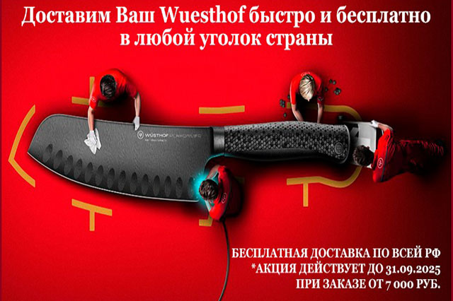 Раньше бесплатная доставка была доступна только при заказе от 30 000 рублей, но мы сделали условия в 4 раза выгоднее, чтобы вы могли наслаждаться профессиональными ножами Wuesthofбез лишних затрат.