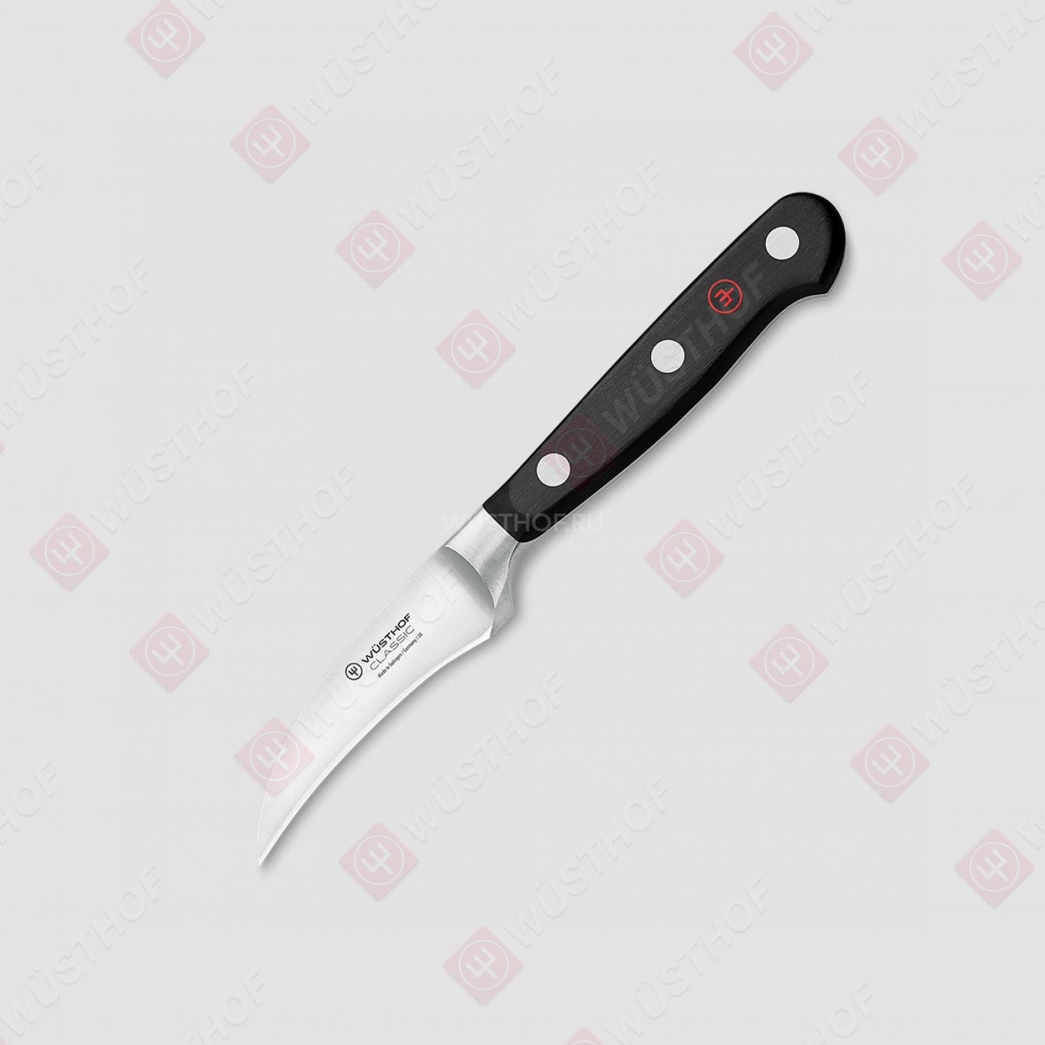 Ножи из серии Classic оснащены клинками из кованой молибден-ванадиевой стали и рукоятьми из ударопрочного синтетического материала, закрепленного на хвостовике тремя мощными заклепками. Двухсторонняя симметричная заточка закаленной до 58 единиц по Роквеллу режущей кромки каждого лезвия обеспечивает длительный безупречный рез, а удобные рукоятки помогут избежать усталости и использовать режущие кухонные инструменты максимально эффективно.