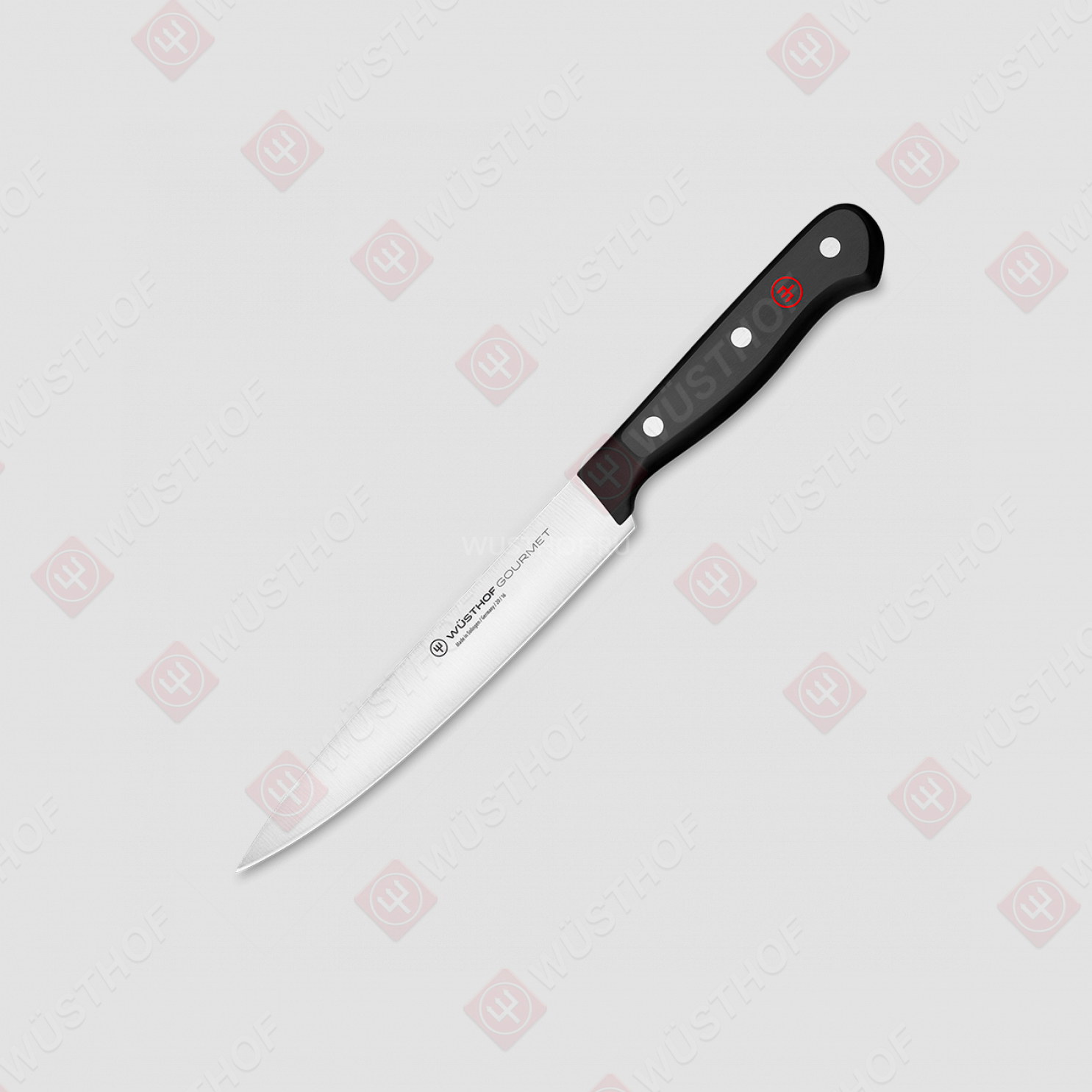 В серию кухонных инструментов Gourmet вошли ножи с клинками из прокатной высоколегированной стали X50 CrMoV15 и рукоятьми из ударопрочного синтетического материала. Рукояти ножей имеют эргономичную форму, большинство моделей – расширение в виде упора на краю рукояти у лезвия и развитую заднюю головку. К хвостовику клинка рукоять крепится двумя или тремя мощными заклепками.