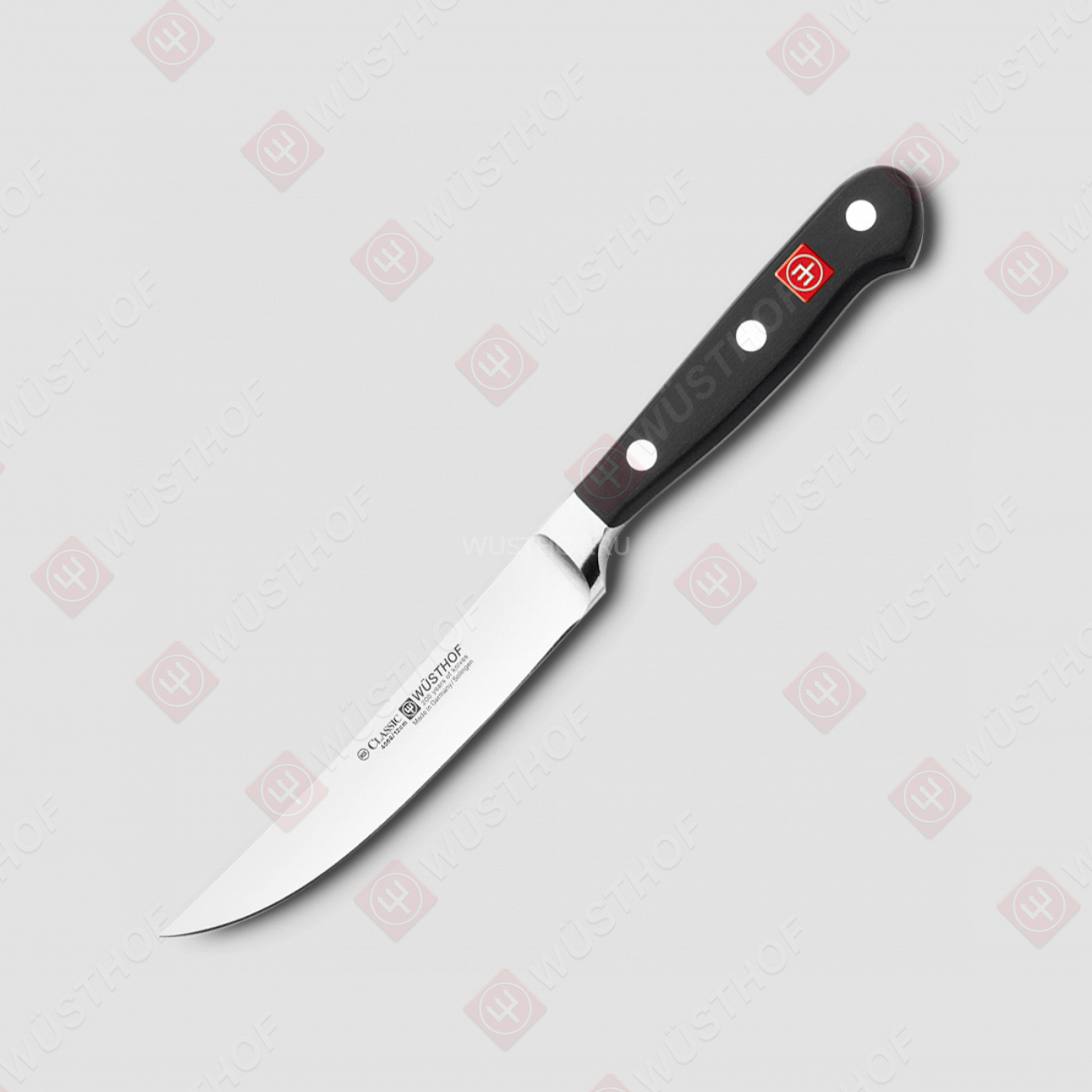 Ножи из серии Classic оснащены клинками из кованой молибден-ванадиевой стали и рукоятьми из ударопрочного синтетического материала, закрепленного на хвостовике тремя мощными заклепками. Двухсторонняя симметричная заточка закаленной до 58 единиц по Роквеллу режущей кромки каждого лезвия обеспечивает длительный безупречный рез, а удобные рукоятки помогут избежать усталости и использовать режущие кухонные инструменты максимально эффективно.
