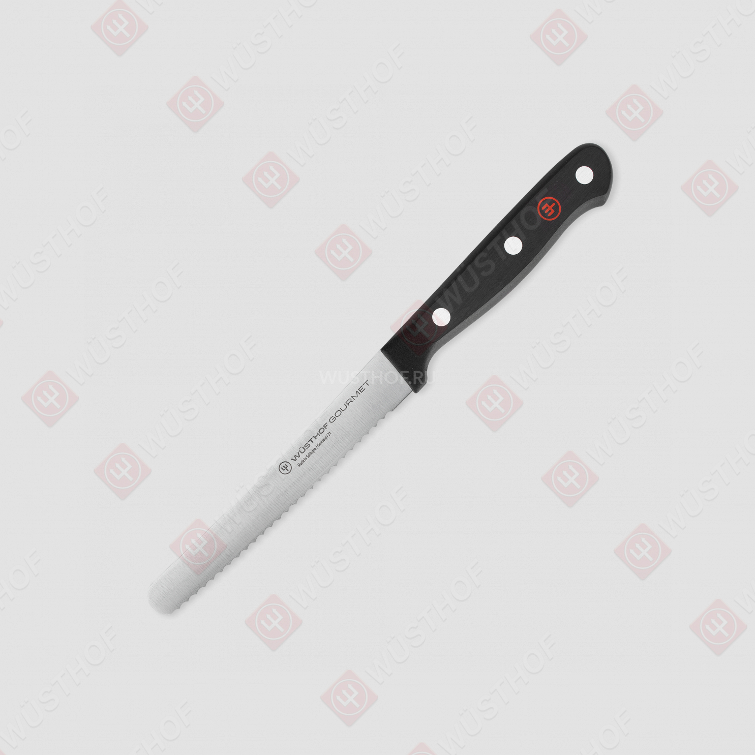Клинки ножей серии Gourmet имеют двухстороннюю симметричную заточку режущей кромки, закаленной до 58 единиц по шкале Роквелла. Лезвия для ножей Gourmet изготавливаются из цельных кусков прокатной стали с помощью новейших лазерных технологий.