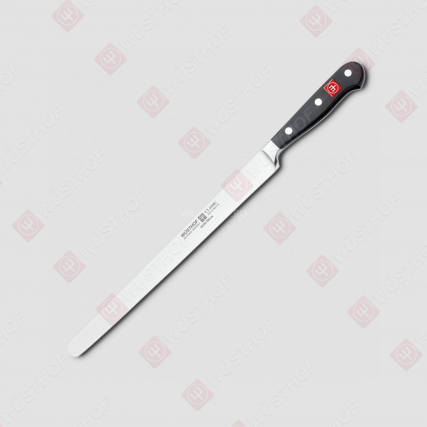 Ножи из серии Classic оснащены клинками из кованой молибден-ванадиевой стали и рукоятьми из ударопрочного синтетического материала, закрепленного на хвостовике тремя мощными заклепками. Двухсторонняя симметричная заточка закаленной до 58 единиц по Роквеллу режущей кромки каждого лезвия обеспечивает длительный безупречный рез, а удобные рукоятки помогут избежать усталости и использовать режущие кухонные инструменты максимально эффективно.