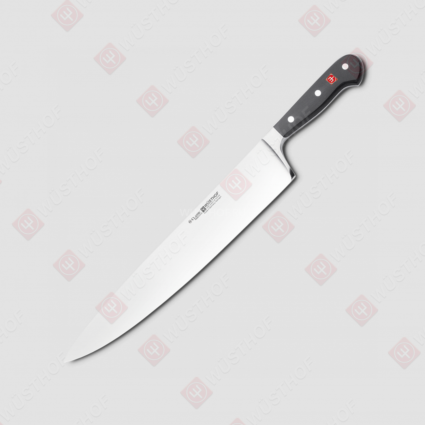 Ножи из серии Classic оснащены клинками из кованой молибден-ванадиевой стали и рукоятьми из ударопрочного синтетического материала, закрепленного на хвостовике тремя мощными заклепками. Двухсторонняя симметричная заточка закаленной до 58 единиц по Роквеллу режущей кромки каждого лезвия обеспечивает длительный безупречный рез, а удобные рукоятки помогут избежать усталости и использовать режущие кухонные инструменты максимально эффективно.