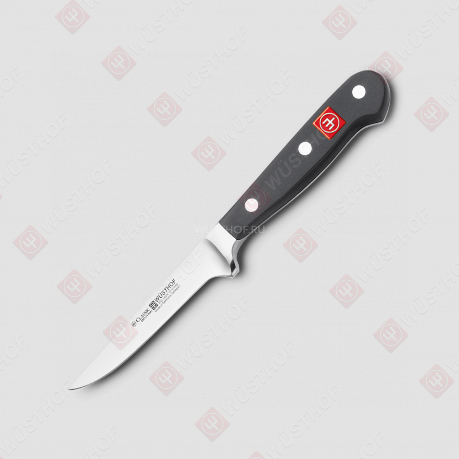 Ножи из серии Classic оснащены клинками из кованой молибден-ванадиевой стали и рукоятьми из ударопрочного синтетического материала, закрепленного на хвостовике тремя мощными заклепками. Двухсторонняя симметричная заточка закаленной до 58 единиц по Роквеллу режущей кромки каждого лезвия обеспечивает длительный безупречный рез, а удобные рукоятки помогут избежать усталости и использовать режущие кухонные инструменты максимально эффективно.