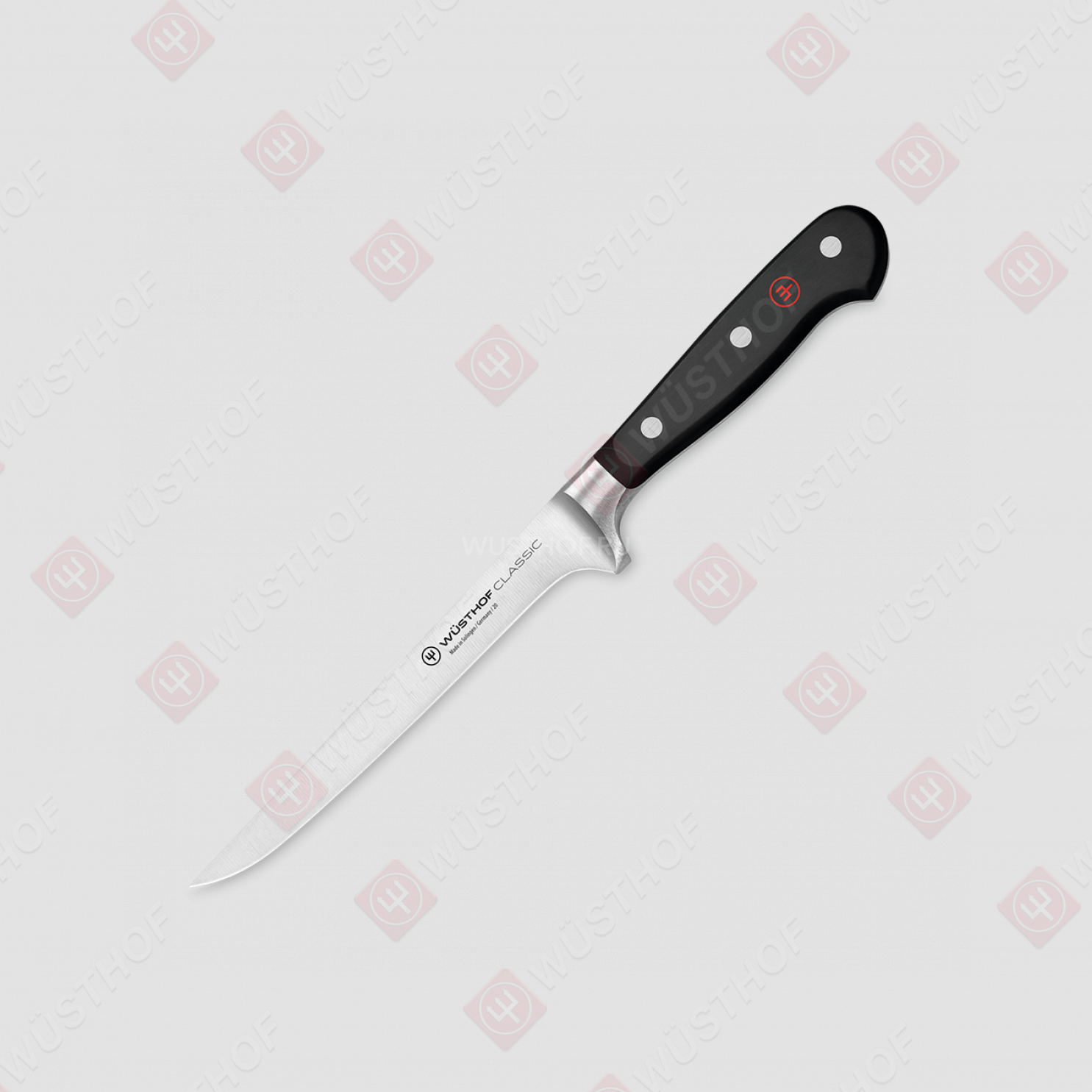 Ножи из серии Classic оснащены клинками из кованой молибден-ванадиевой стали и рукоятьми из ударопрочного синтетического материала, закрепленного на хвостовике тремя мощными заклепками. Двухсторонняя симметричная заточка закаленной до 58 единиц по Роквеллу режущей кромки каждого лезвия обеспечивает длительный безупречный рез, а удобные рукоятки помогут избежать усталости и использовать режущие кухонные инструменты максимально эффективно.