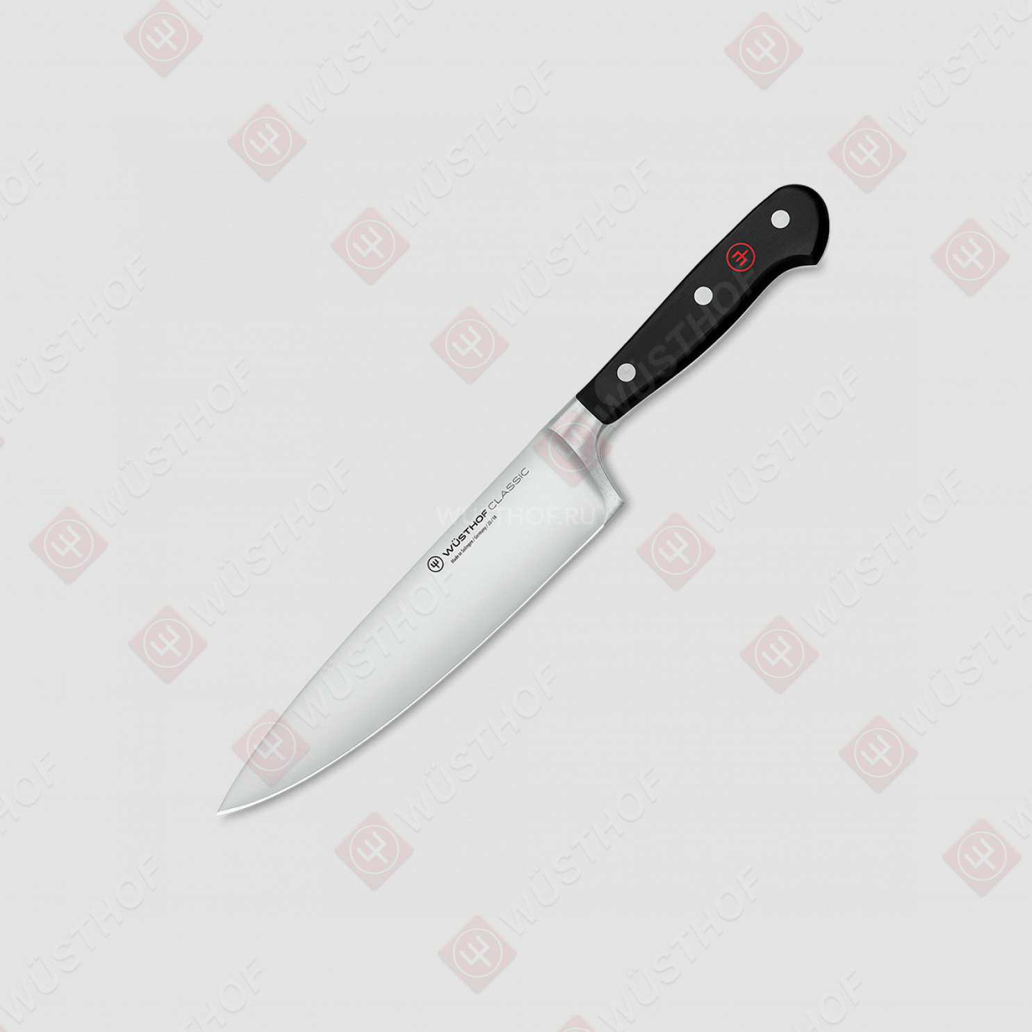 Ножи из серии Classic оснащены клинками из кованой молибден-ванадиевой стали и рукоятьми из ударопрочного синтетического материала, закрепленного на хвостовике тремя мощными заклепками. Двухсторонняя симметричная заточка закаленной до 58 единиц по Роквеллу режущей кромки каждого лезвия обеспечивает длительный безупречный рез, а удобные рукоятки помогут избежать усталости и использовать режущие кухонные инструменты максимально эффективно.