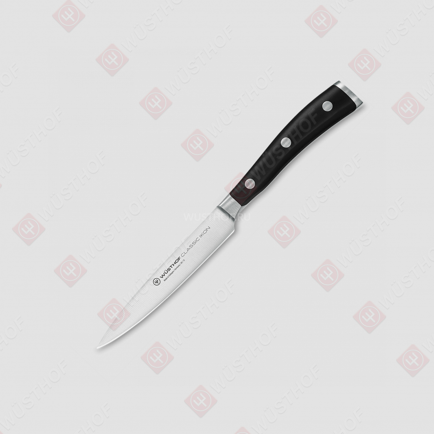 Кованая золингеновская сталь клинков закалена до оптимальной твердости (58 единиц по шкале Роквелла), что гарантирует хороший длительный рез и дает возможность править режущую кромку мусатом. Рукоятки ножей закреплены к хвостовикам с помощью трех мощных заклепок.