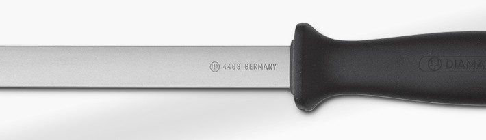 Специальная форма алмазной абразивной поверхности адаптирована для формирования максимально острой режущей кромки. Сердечник мусата изготовлен из твердой нержавеющей стали.